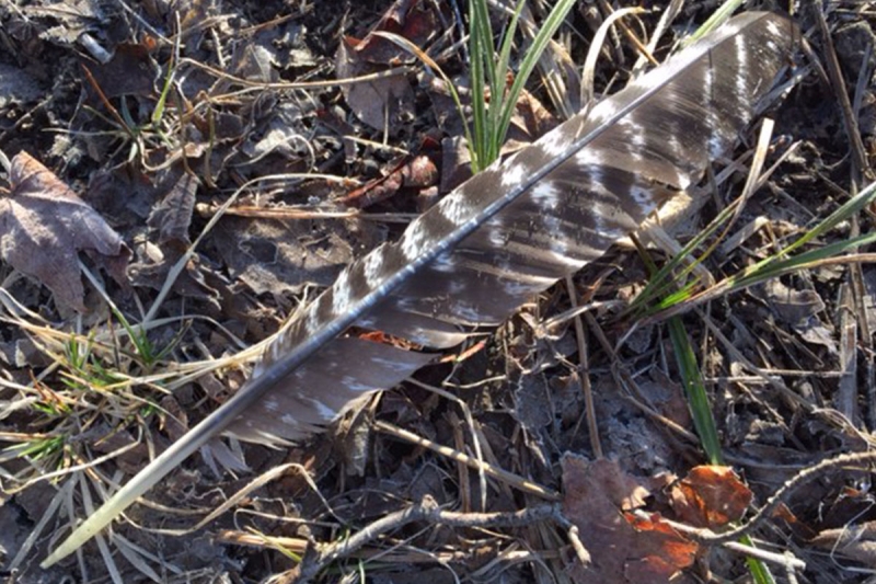 I'm pretty sure this is a primary feather from a turkey. Such a beautiful design. I heard a gobbler here yesterday. If you find a feather and you'd like to identify it, check out this cool website from the US Fish and Wildlife Service: https://www.fws.gov/lab/featheratlas/index.php
