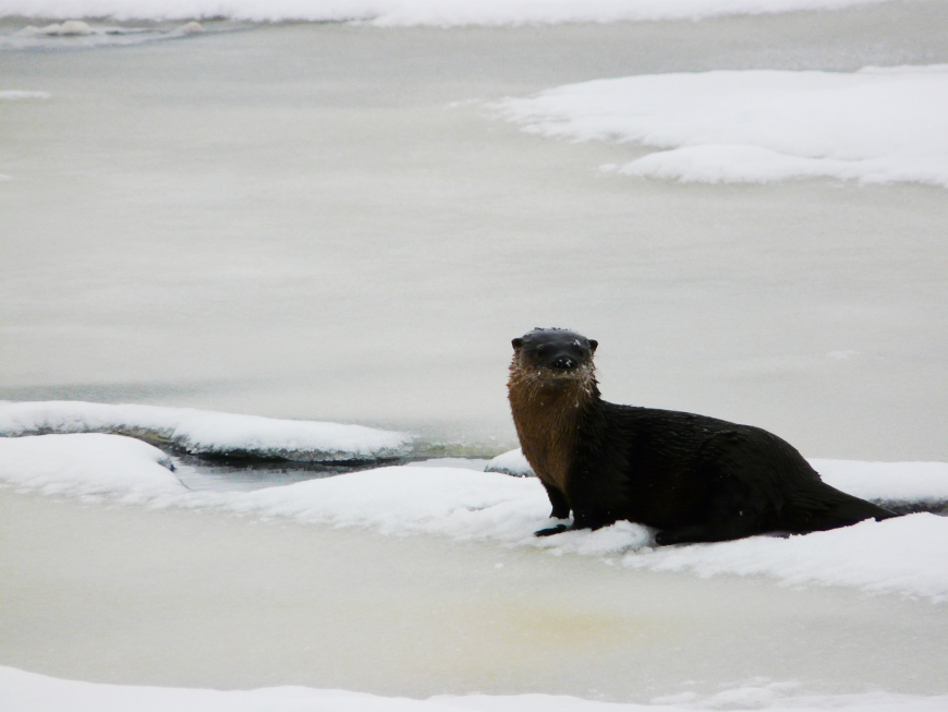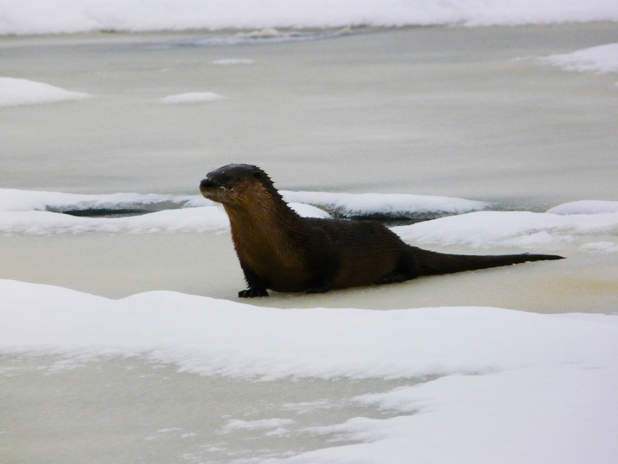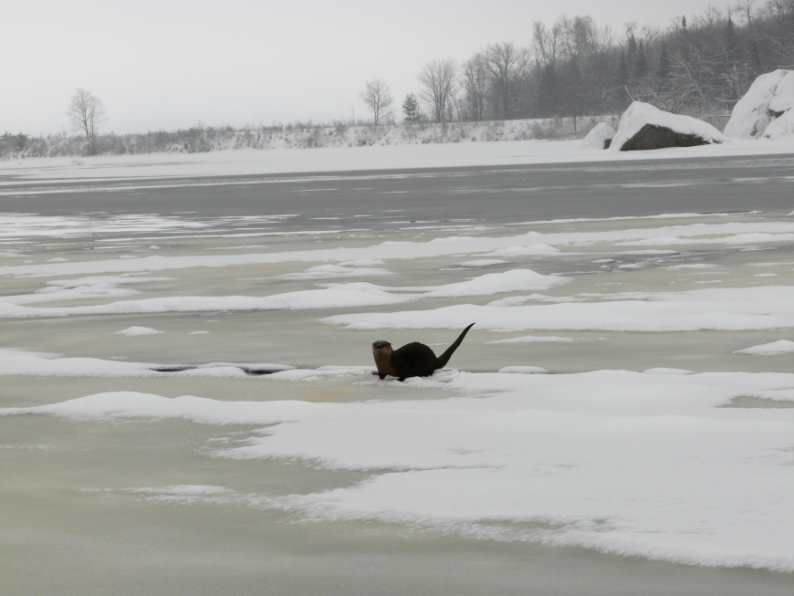 This spot, where Tupper Lake narrows into the Raquette River, is ideal for river otters. The river here never freezes completely, allowing otters plenty of openings to slip into the icy water and catch fish. Several times during the day I saw them on the ice, only to run outside with my camera and discover that they'd disappeared into the water again. Finally three of them stuck around for a while. I watched them hunt for about ten minutes before they moved down river. Awesome creatures.