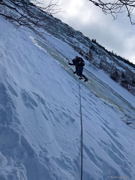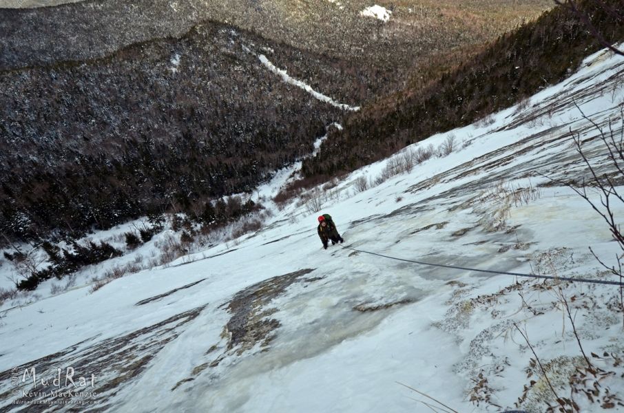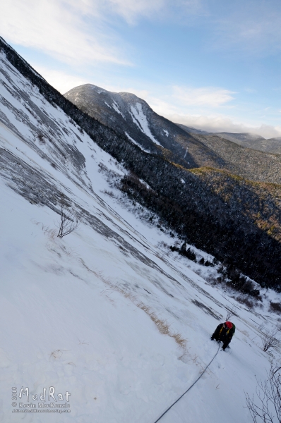 Ranger Scott and I tagged Gothics’ North Face yesterday. I’ve never gotten on it during November so this was quite a treat. We took a chance and had a great day as a front moved in. I feared it would be covered with some un-bonded snow, but we found a mixed back of snow climbing, ice climbing, and scratching up bare rock. The approach involved breaking through a couple feet of virgin snow from the Orebed Trail to its base. Clouds enveloped us and strong winds pounded drove the spindrift as we climbed the top 400’ to the ridge where we found 4-5’ of snow. Real winter conditions are on the summit. In all we had a 13 hour day.