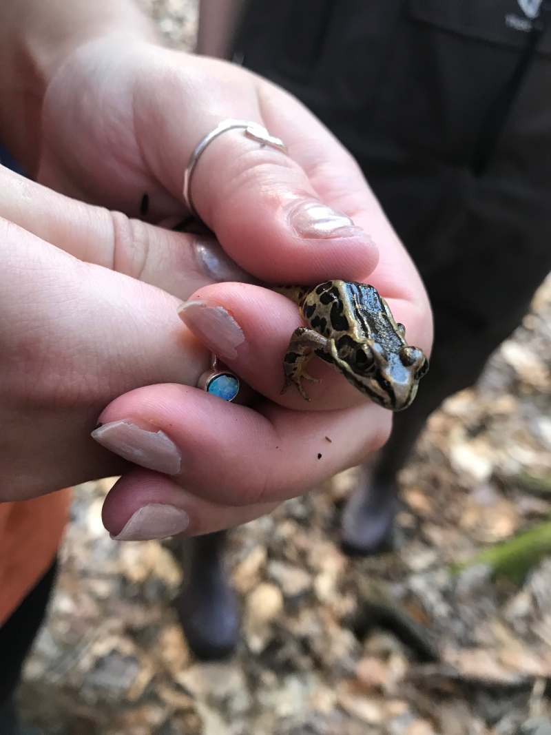 A pickerel frog (Rana palustris, adult) found next to a fast moving stream at Glenmeal. Pickerel frog are easily confused with southern leopard frogs (Rana sphenocephala), but pickerel have more rectangular/squared spots.