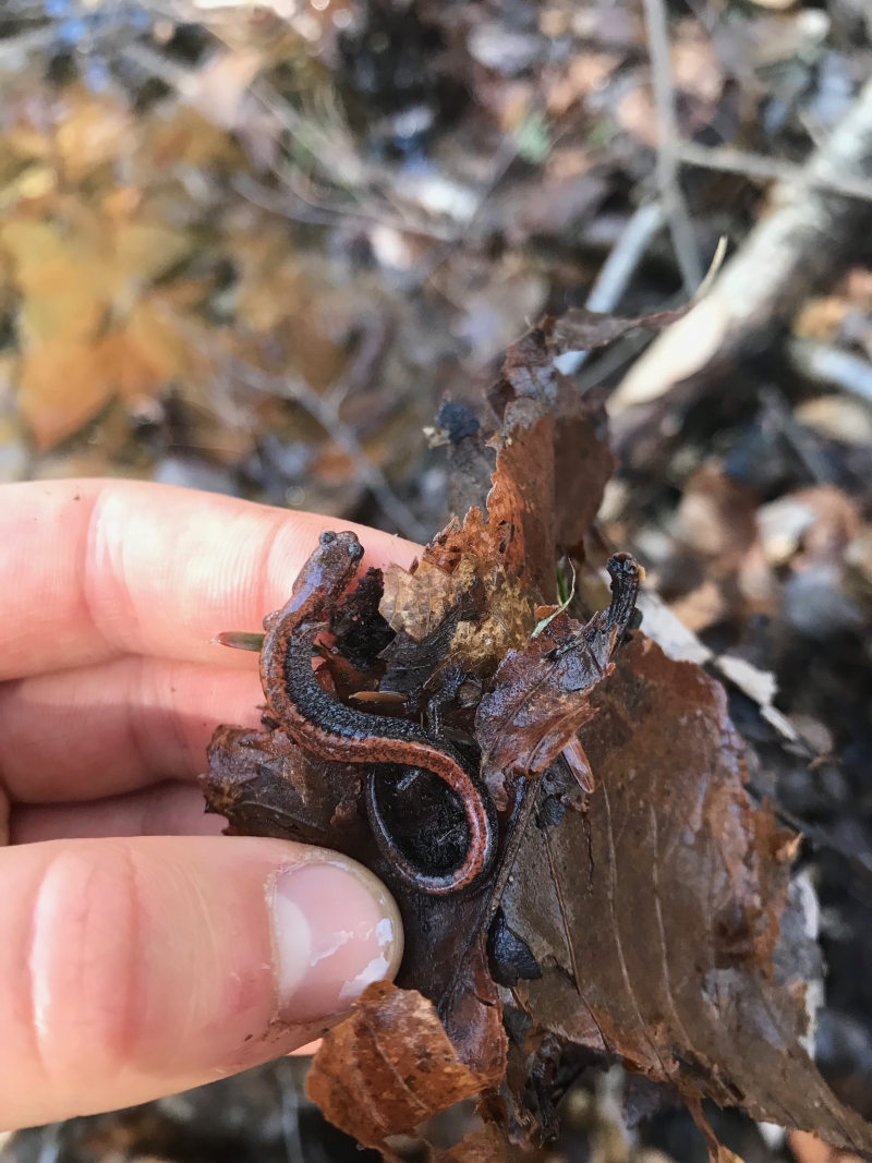 Another red-backed salamander (Plethodon cinereus, adult) found at Glenmeal, also under a log! Tried to avoid handing directly with my skin because I wasn't wearing gloves - soaps/lotions from our hands can really hurt their delicate skin - they perform cutaneous respiration.