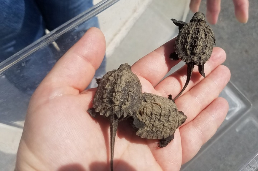 Baby snapping turtles have started emerging from the nests around the property. These little guys were in the driveway and moved safely to the lawn to continue their trip.