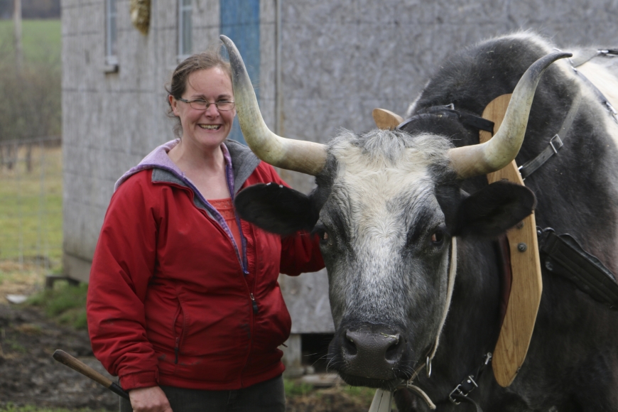 It saves me fuel, and it’s low impact. And there’s a lot of ridges here [she points to the back of the property, behind the pasture], like those ledges, and you can’t get in there with a tractor to cut firewood. And we burn wood, so the ox can get wood out where we couldn’t cut otherwise. And they’ll go through, and if I can walk a path, Nip can skid a log that, just a person’s width, and two months later you’ll walk through there and it’ll look like a deer trail. You can’t even tell he’s been in there. So it doesn’t tear up the land like a log skidder or you know, heavy traction equipment. If I was gonna sell wood commercially, it would not be the fastest way to get it out, but just for our situation its perfect and it doesn’t cost anything. We’re utilizing our resources, you know?
