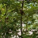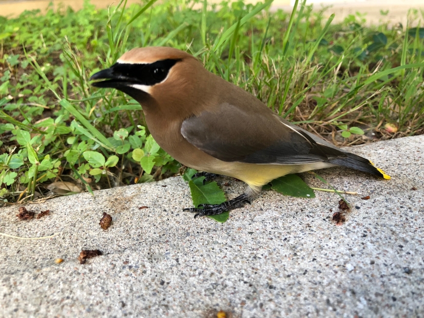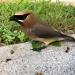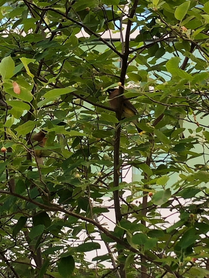 Walking back to my office after a meeting, I noticed a stunned cedar waxwing lying on the ground. I could see its tail moving, so I gently set it up on its feet. Got this photo after righting the bird. I suspect it had flown into a window. The area is planted with juneberry trees (shadbush, Amelanchior) which are in fruit right now and attract lots of cedar waxwings. The second photo is one of the waxwings in one of the trees.