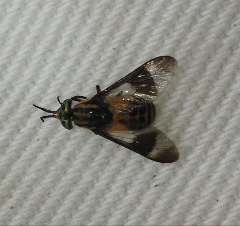 This female deer fly was biting my dog (and I think many of her sisters had been biting me!) so, after dispatching her on my dog's head, I took this photo. I identified it as belonging to the species Chrysops geminatus based on the great on line photo-based key at http://www.biology.ualberta.ca/bsc/ejournal/tm_08/chrysops89.htm produced by the Biological Survey of Canada. This species occurs throughout the eastern US, Ontario and Quebec. Notable but a little difficult to see in the photo are two brown dots in the center of the animal's back, surrounded by yellow.