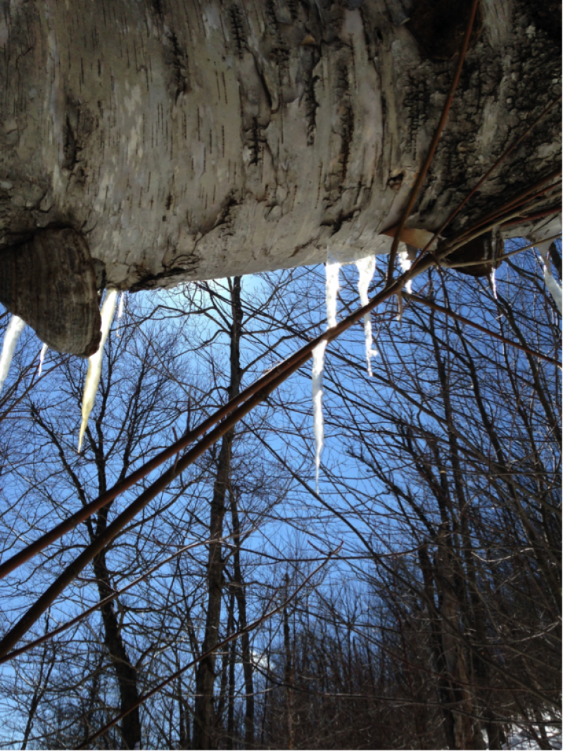 Here we see water slowly going from its solid state into a liquid state. They are hanging off a birch tree with a fungal growth in the corner. I really like the angle of this picture because you can tell that the sun is shining brightly just behind the imposing birch shooting across the top. The details of the cracked tree bark are clearly visible as well as the shape of the icicles like stalactites. Also, there are two icicles in the center that create somewhat of an illusion; one of them ends just to the side where another begins but it looks as if the bottom half of one icicle just shifted a bit to the side. The hydrogen bonds are a key characteristic of water that arises from the structure of a water molecule. It allows ice to increase in volume when freezing which is unique to that molecule, as most substances decrease in size in accordance with lower temperature.