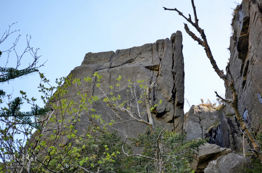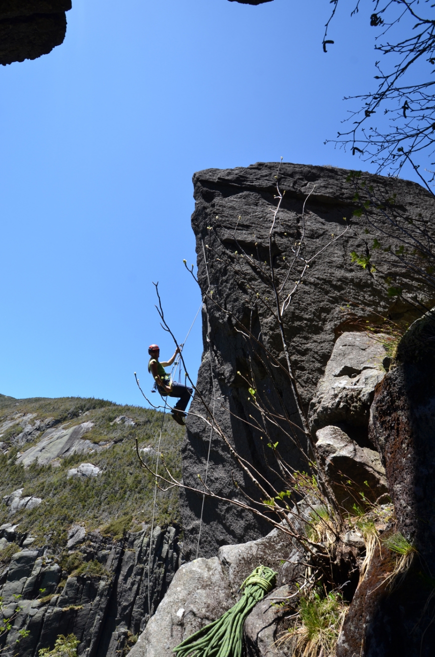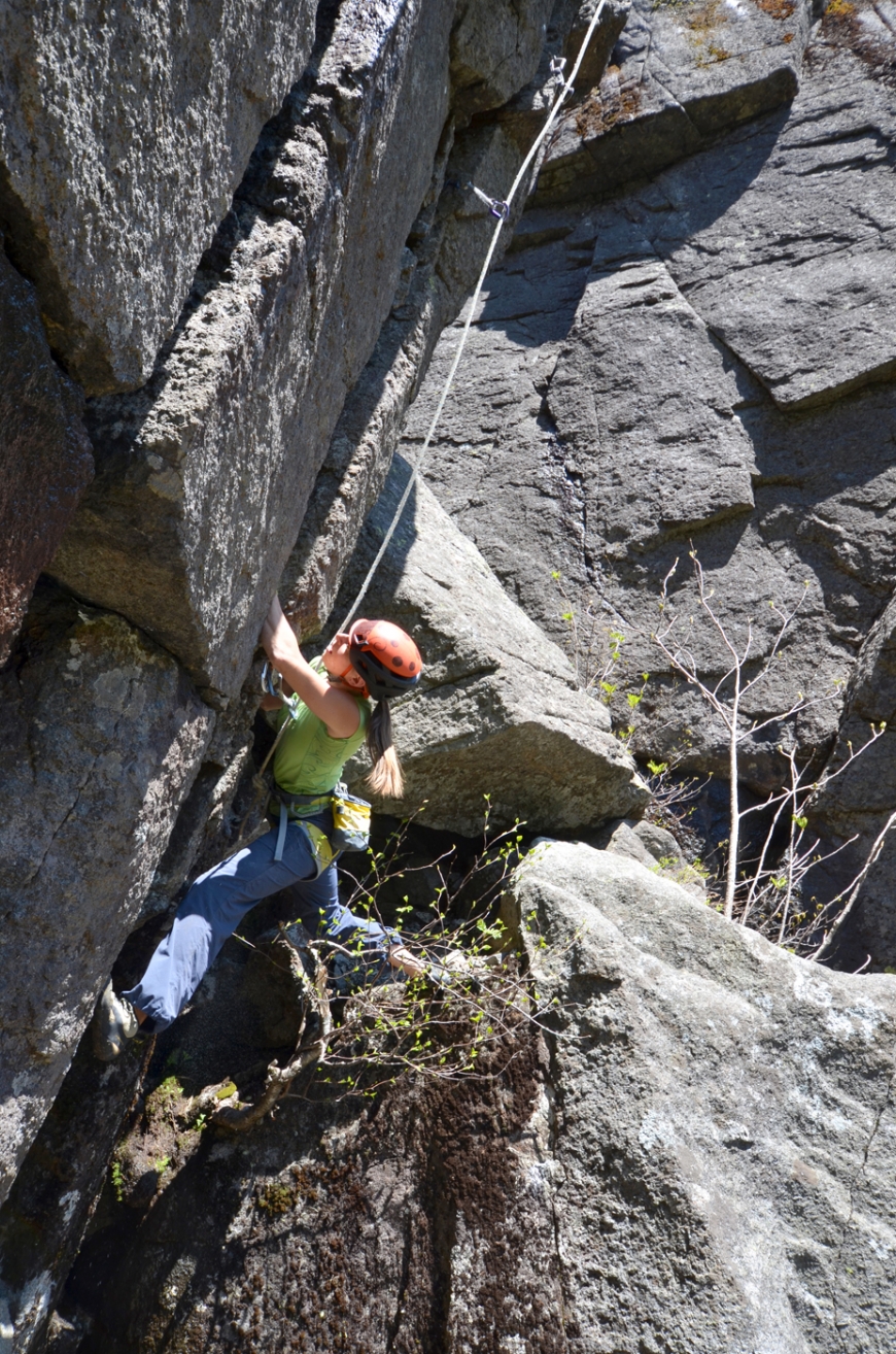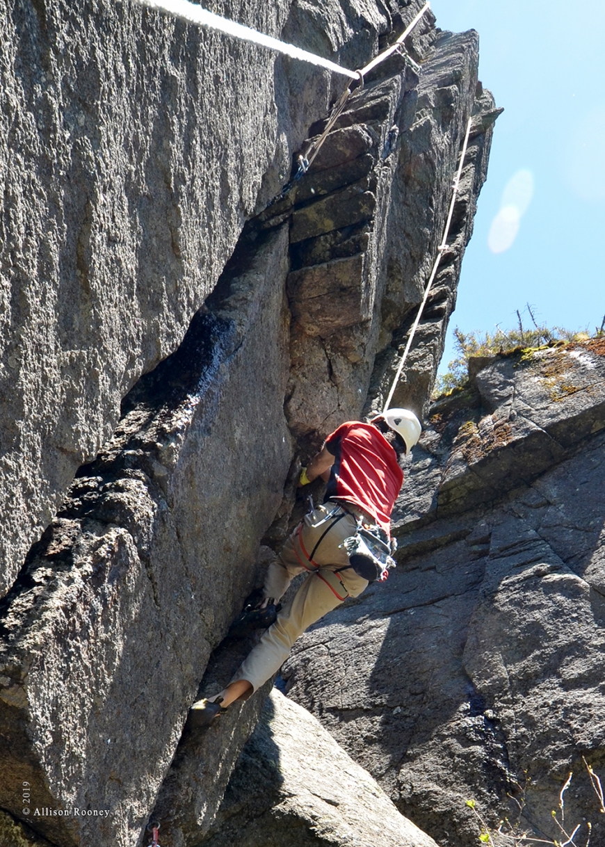 The southern end of Haystack’s Ramp Wall overhangs by 20 degrees based on a clinometer. A deep hand/fistcrack runs 55’ from the ground to its top. Even given the recent wet weather, the line was entirely dry. Allison set up a top rope and we went to work under a bluebird sky with no blackflies and a light wind. By 4 PM we had a 5.11d line up--Lioness Rampant. Her last burn was a clean run; my lap wasn’t so clean, but I made all the moves and a couple hours later (and after messing with an adjacent line) my forearms stopped pounding. We ended the day at 11 PM, 18 hours after walking in from Loj.