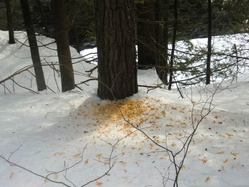 Finding these tree bark pieces on the floor of the forest was a real treat for me because I knew a porcupine had been there. Peckerwood use they hard adapted bills to peck the trees, looking for insects in the trees. The tree was a sugar maple and upon further inspection, the bird had really caused a lot of damage to the tree and I was wondering how it was going to recover and heal itself. One thing I found interesting about this image is the tree matter on the floor of the forest will decompose and nourish the other life in the forest.
