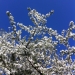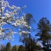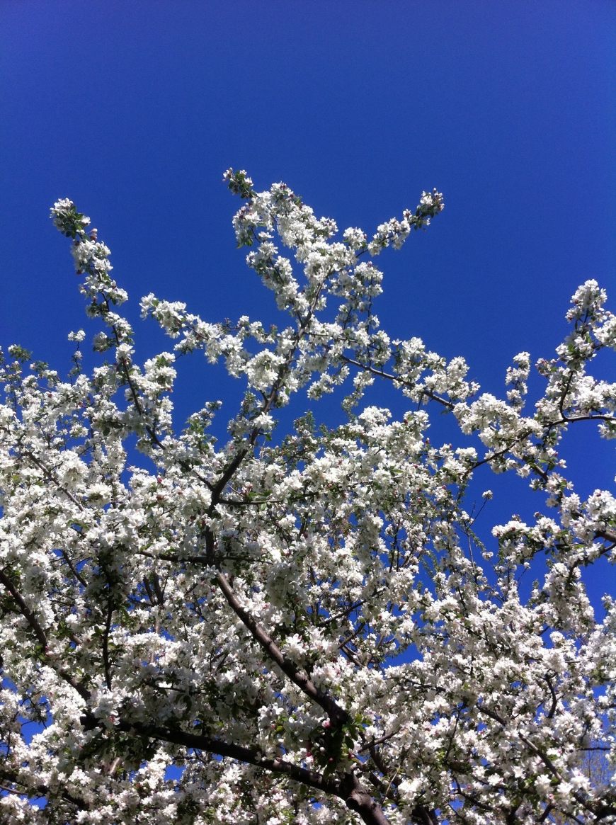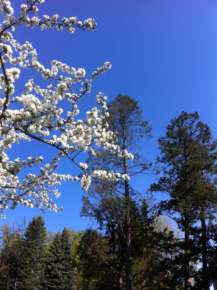 Flowering apple treein the sunshine and a deep blue sky. Tall pines to the north. A beautiful spring day!