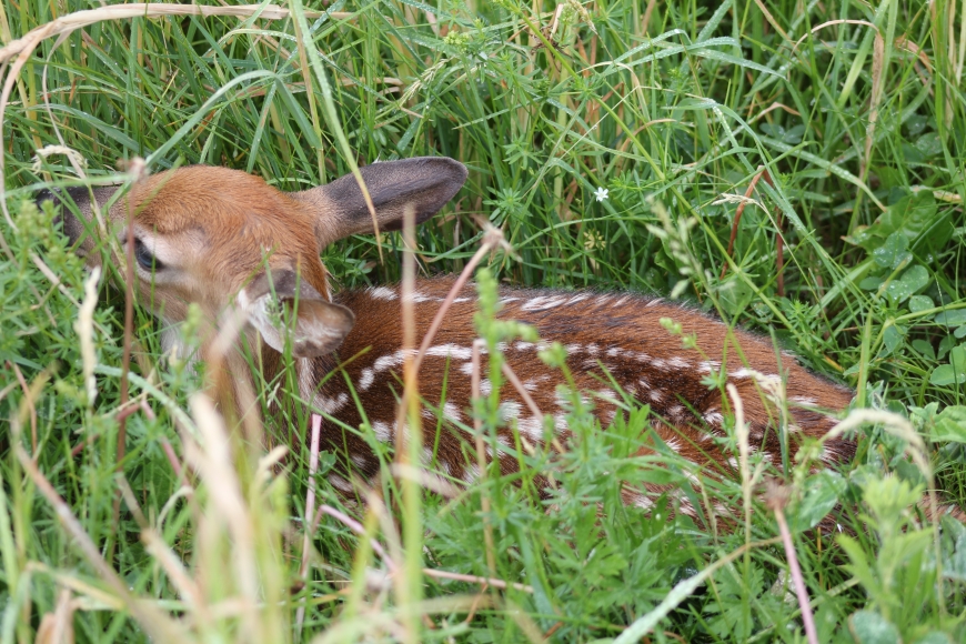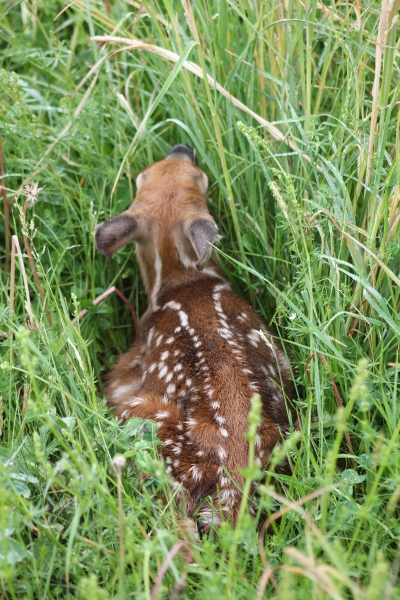 A newlyborn fawn was in the front field outside of the house. We saw it wobbly around and then silently laying in the grass. Just beyond, another baby was wondering about.