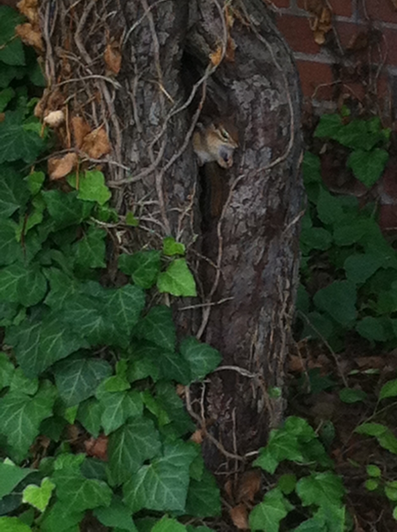 This little chipmunk was firmly ensconced in the hollow of a tree in front of Vilas Hall, while several of his friends were scampering about below in the ivy. There seem to be LOTS of chipmunks about this year....unless they are only haunting (stalking?) me.....