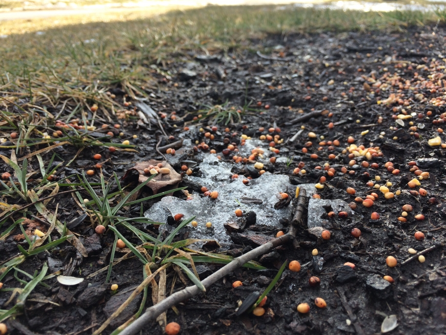 An unseasonably warm day for Canton in February (35 degrees!) called for a walk outside. There was little snow to be found, and I stumbled upon some birdseed scattered in the fall that had been uncovered by the melting snow.