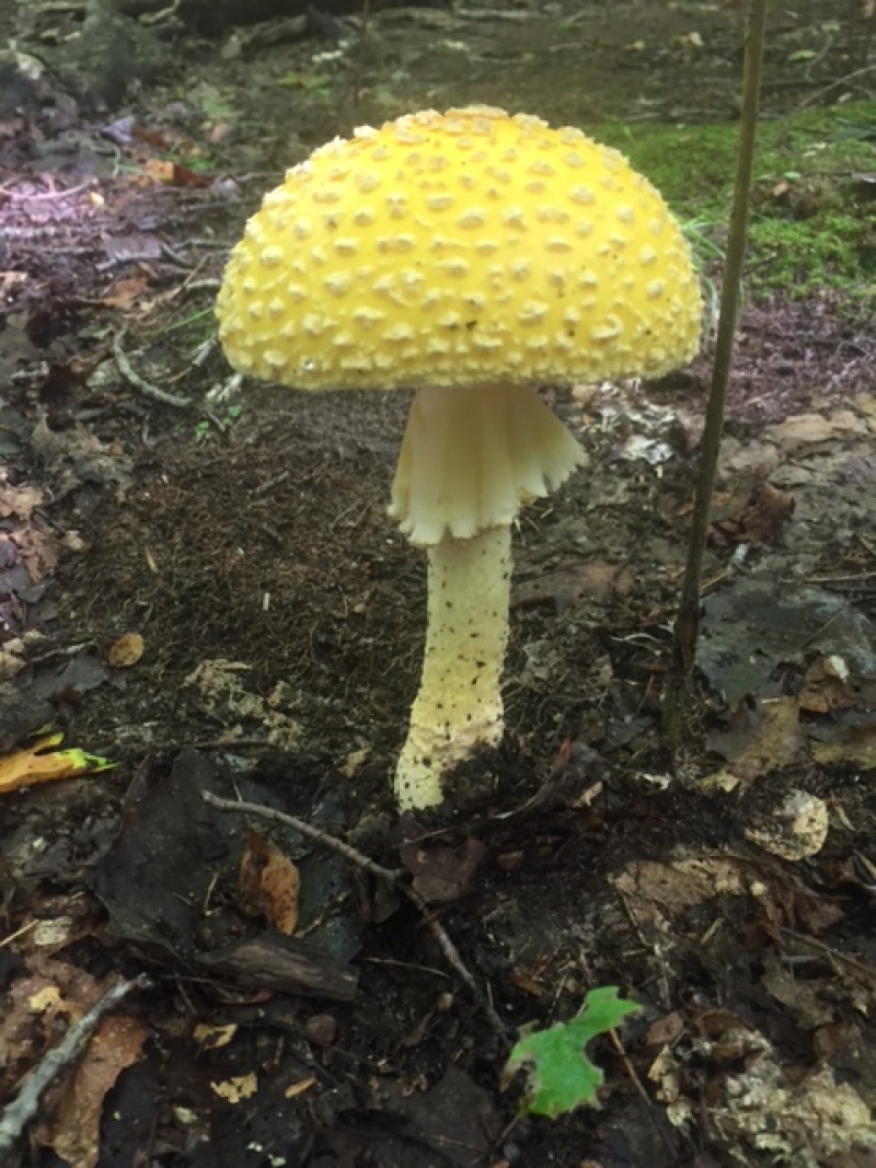 My mycology class was out looking for mushrooms and came across this beautiful mushroom, Amanita citrina. Its common name is the False Death cap. I found this mushroom interesting because of the the florescent pileus (cap). Being able to identify all the parts of the mushroom was another a fun part of my encounter: being able to fully see the annulus which is the web like tissue hanging from the stipe of the mushroom. Also, to see the warts (universal veil remnants) was very neat because you would look at the same species right near this mushroom and did not have these warts, showing the different life stage of the mushroom. Making this another reason why identifying mushrooms very hard. Over all this was a beautiful day to see the colors that mushrooms displayed all over the forest floor.