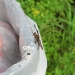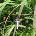 Male dragonfly has distinctive blueish white tail and black wing stripes. Female is mainly brown with similar wing pattern and white spots on the sides of the tail segments.