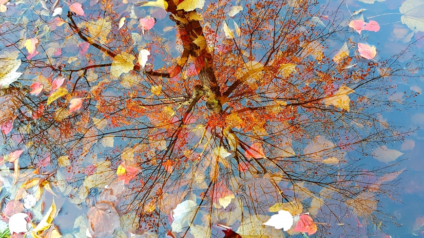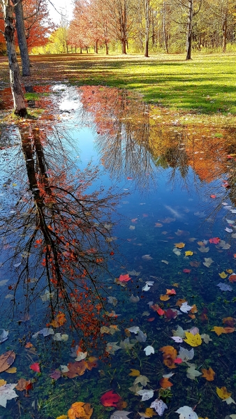Even puddles in autumn look pretty! The reflection of clear blue sky and autumnal foliage in a puddle can be heavenly!
