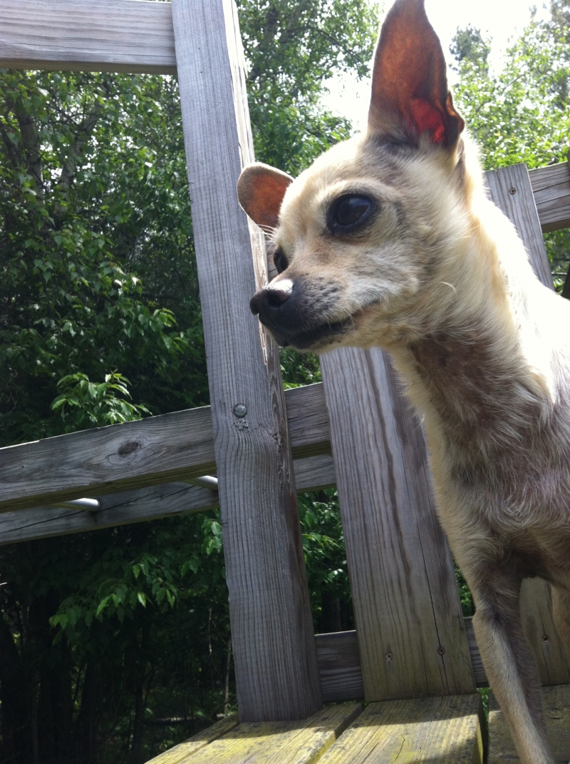 After I took the picture of my dog, she jumped off the play set and it is about a five foot drop and she is a chihuahua and I caught her.