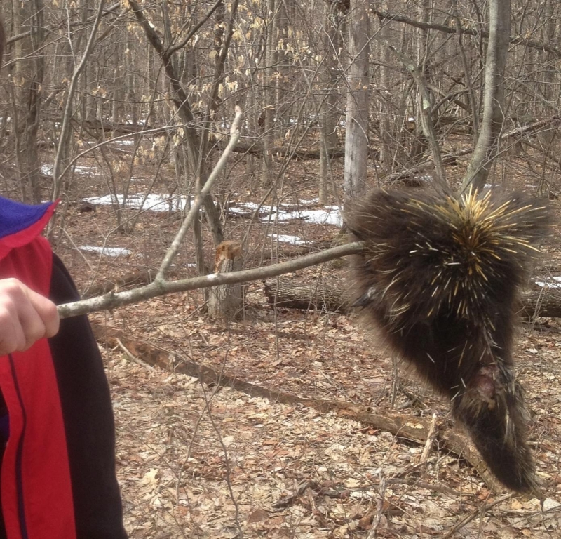 During a lab exercise for reflective writing, I was walking around a woodland area about 100 yards offshore from a river. I found this porcupine pelt on the ground in between trees. After showing it to Dr. Visser, it was determined that the porcupine had been killed by a fisher. Fishers eat the face of the porcupine first, and there was nothing left of this animal except for the pelt.