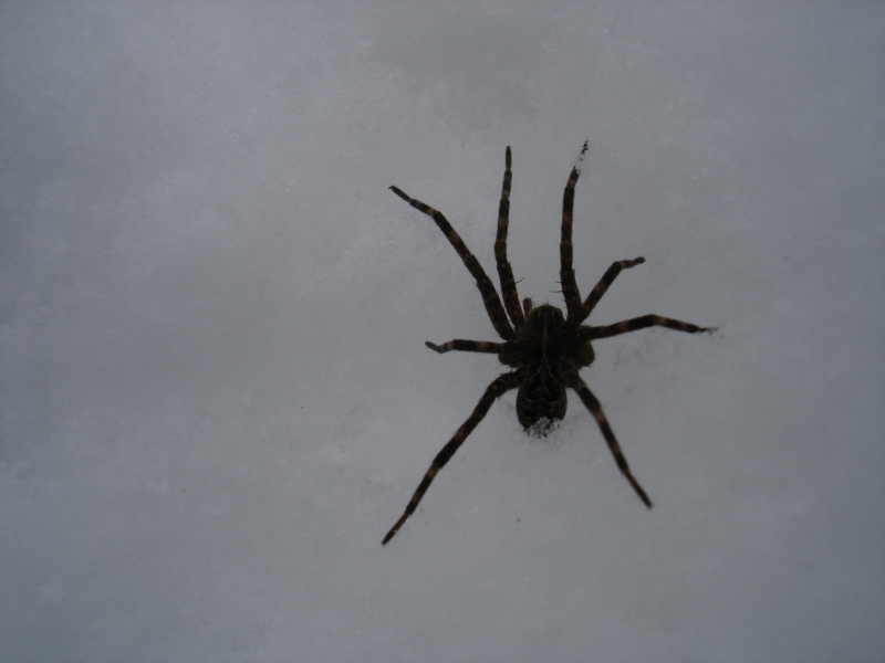 About 1 foot of snowpack, cold, dry, overcast. In the middle of the trail, we found a wolf spider, alive, but completely still. No web was in site. Halfway down the river left trail at Stone Valley.