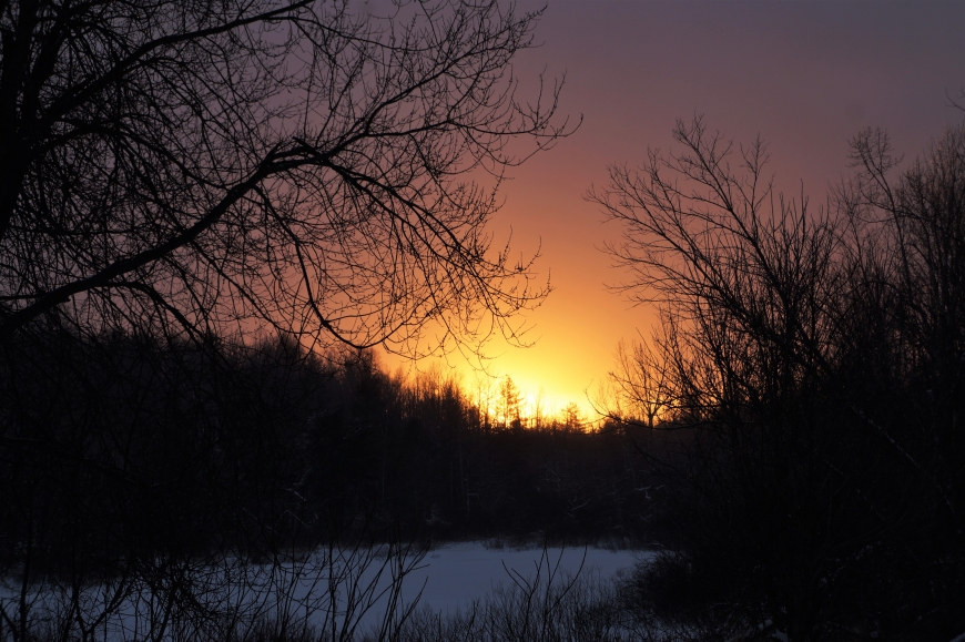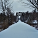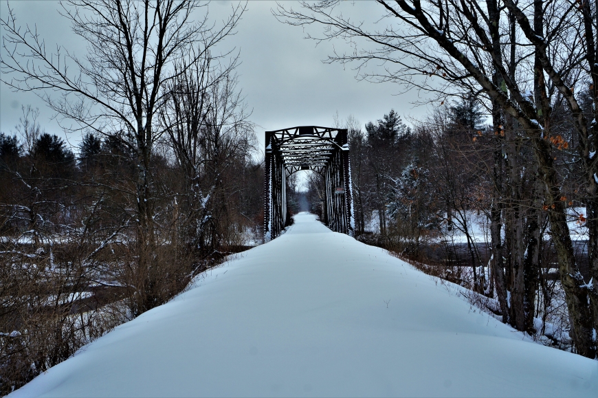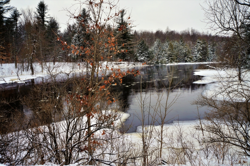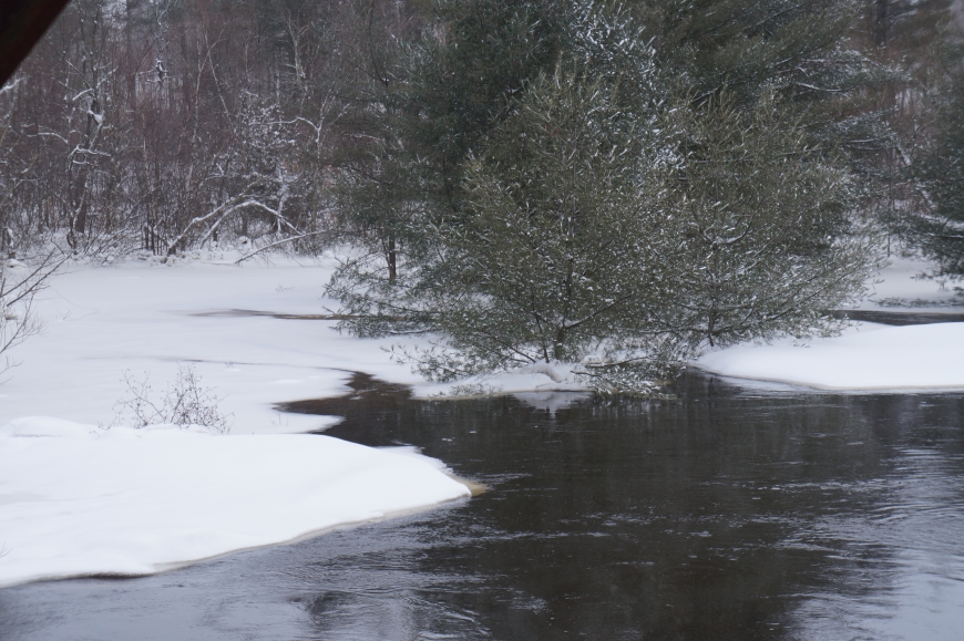 The day before was 58 degrees with heavy rain all day, and down to zero by morning. Add in a foot of snow overnight and the Oswegatchie river was as high as it gets in the spring. The water was running at least 6-7 feet above normal, and had already dropped about 18" by the time we were there in the afternoon. There was a pretty big ice jam several hundred yard downstream of the trestle. The water and ice were backed up about 200 yards into the woods from the banks of the river. It was only 2 degrees, but made for a fun and quick snowshoes trek.