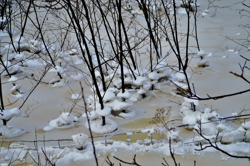 Notice the ice on the brush. That page-wire fence is four feet high, and normally on dry land..