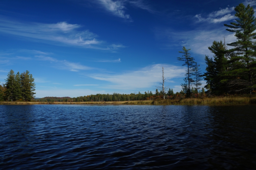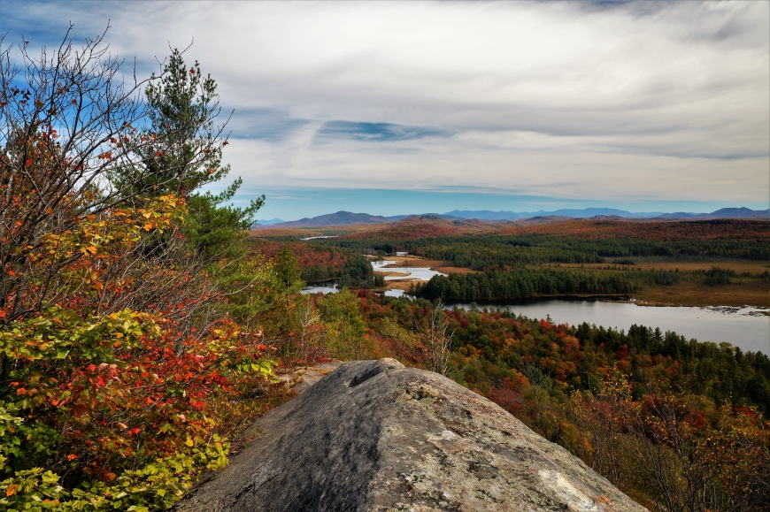 This is my all-time favorite trek in the Adirondacks. The paddle is along the Bog River (Piercefield) from Low's lower dam to the upper. From Hitchens Pond, we hiked to the overlook which gives amazing views of the Bog River basin, the High Peaks and the Horseshoe Lake wild forest. On the paddle out, we spotted a nice bull moose along the water's edge. The leaves are not quite peaked yet, but probably will be within the next week or so. The trips total mileage is about 8.5 miles (boat & boots combined).