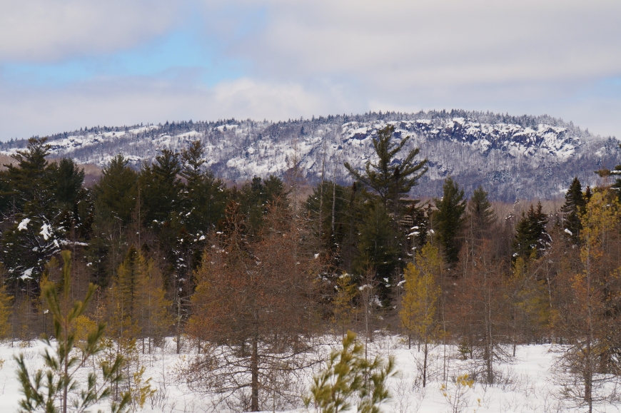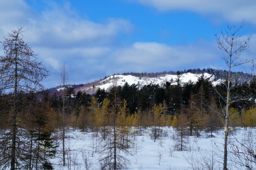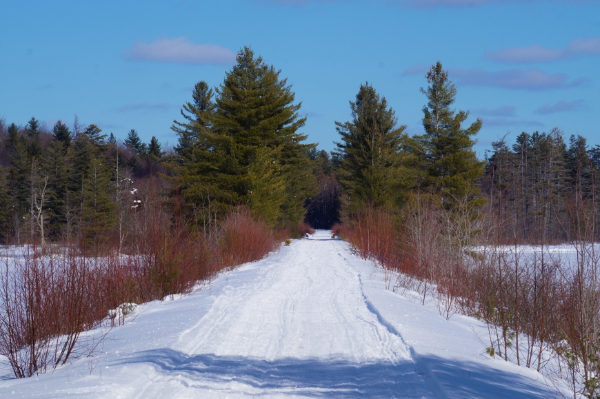 This trek was along the Rail Road grade from Horseshoe south, to "the big rock". The views of the former Low's holding a great along here, especially the overlook above Hitchen's Pond. I parked at the end of the plowed road (RT 421) and snowshoed in from there. I did a short bushwhack just north of the Horseshoe Lake outlet and then followed the tracks south. Round-trip was 6 miles total.