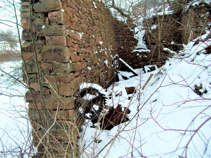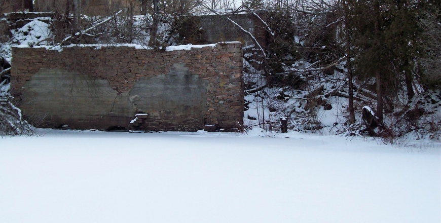 The back side of the foundation of the old gristmill on "the island". Picture taken from the mill pond.