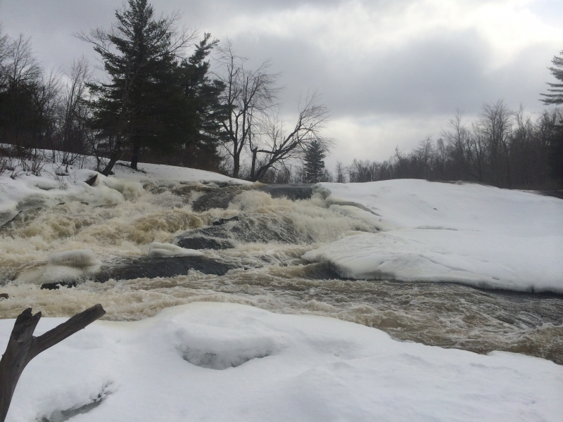 We walked the wooded trail that leads directly to the falls and then we followed the trail by the banks of the river in search of porcupines and hopefully even some otters. The half frozen falls were very cool. Even though much of the river was still frozen the waterfall still had a very strong flow.