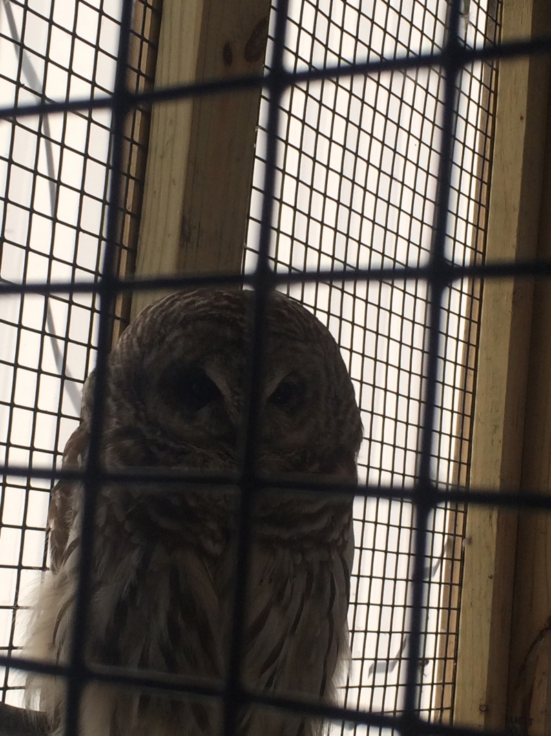 This is a close up of an Owl that lives at the Wild Center Museum in Tupper Lake, NY. I was amazed and how calm and poised the Owl remained even when I had a camera very close to it. It is a beautiful bird. Unfortunately I couldn't avoid capturing its cage in the shot as well.