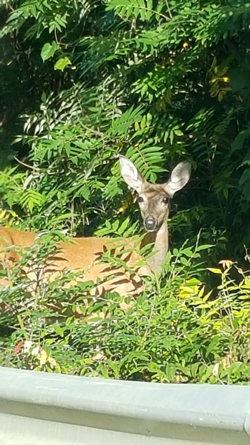 Driving, midmorning, into the village of Morristown, NY via Chapman street, saw deer browsing just the other side of guard rail. She stood there for many minutes checking us out, giving ample opportunity to snap photos.