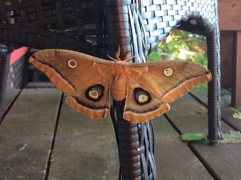 The moth was on a chair on the deck of our camp, which is in a densely wooded area right on the water. Our resident moth expert (Pete Wyckoff) thought it appeared to be just "hatched" from its chrysalis. I arrived late afternoon and it stayed in the same place until dark. It was gone in the morning.