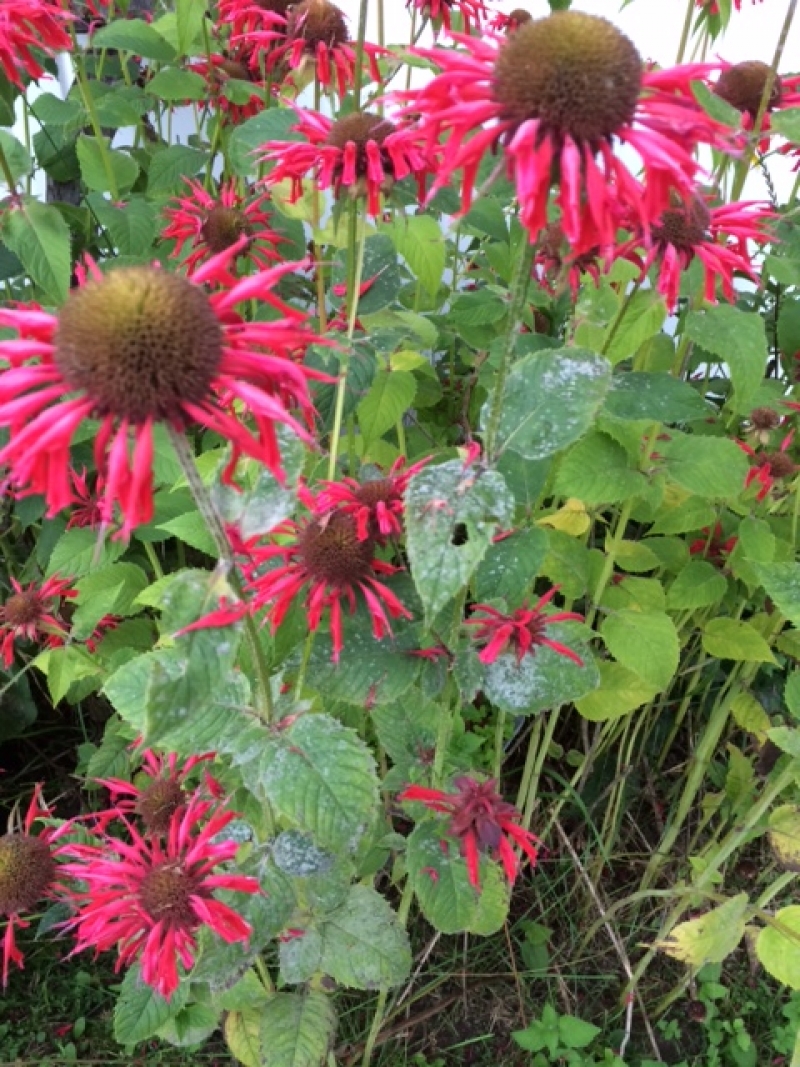 Weeding in my flower garden today, I discovered powdery mildew on some of the Monarda. In the past I have sprinkled Sevin Dust on them but now would like to find a more organic remedy to rid the yearly appearance.