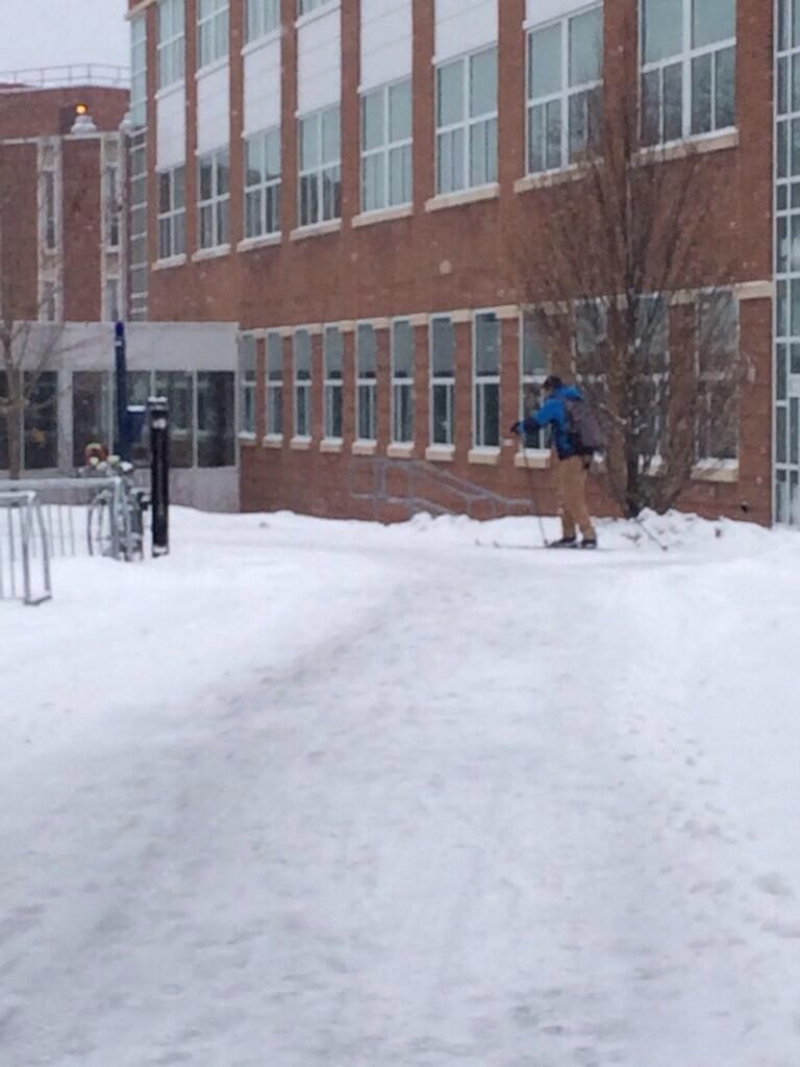 Seeing somebody actually skiing to get from class to class was comical, not only because it wasn’t something you see every day, but because it made a whole lot of sense. What a smart idea! Because the snow impacts very little friction, it’s more than four times as fast to ski to class as it would be to walk, or even run. Especially in the cold, snowy temperatures of northern New York, you need to find a quick way to get from warm classroom to warm classroom, and this guy certainly did!