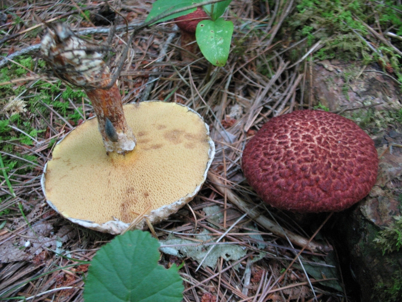 Hypomyces completes is a parasitic fungus that grows on other fungi, In this case causing Suillus pictus to turn completely white. This photo shows Suillus pictus on the right and an infected cap of Suillus pictus on the left.