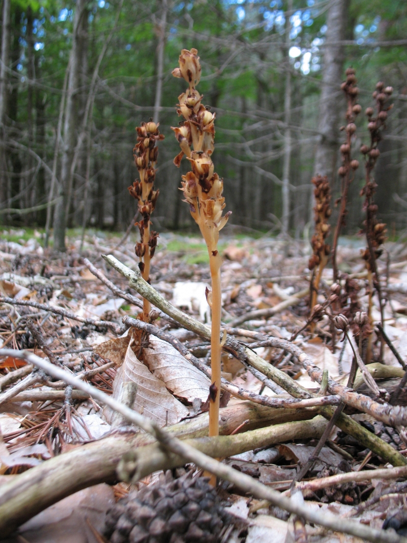 Monotropa hypopitys along the trail beneath Pinus sylvestris and Pinus resinosa.