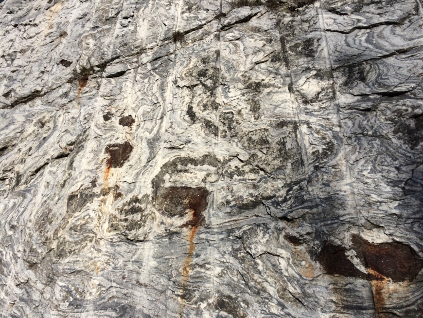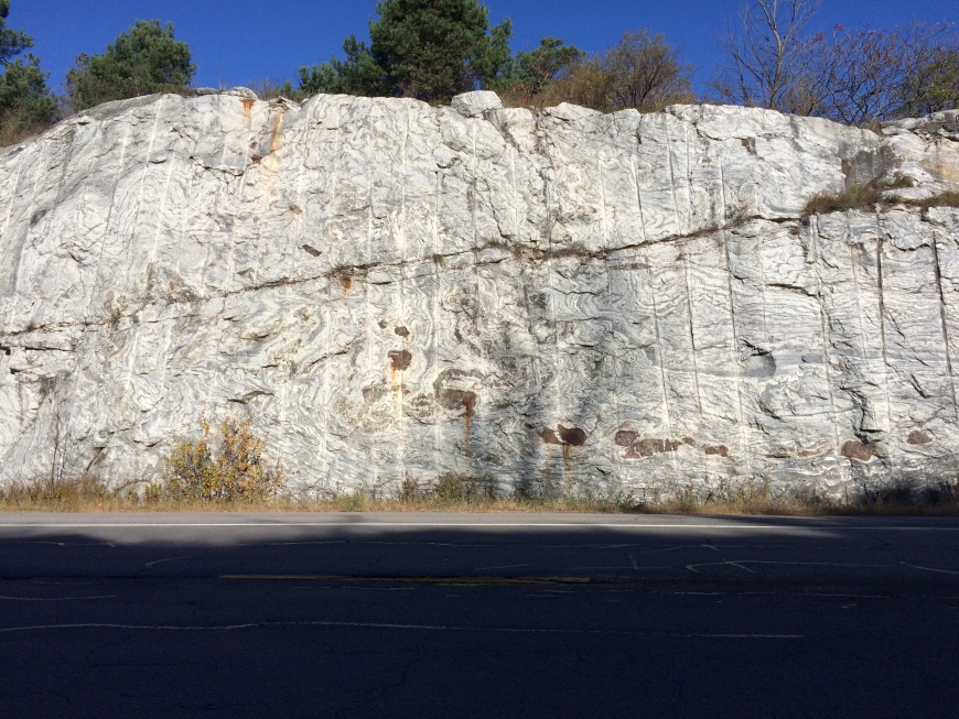 This roadcut is called the "Train Wreck". The majority of the rock in the picture is Grenville-aged marble (~1.3 billion years old). The marble was once cross-cut by a mafic dike. This vertical intrusion was then broken up into the dark mafic blocks that you see in the image. This roadcut gives us an idea of what the shape the interior of mountain belts look like.
