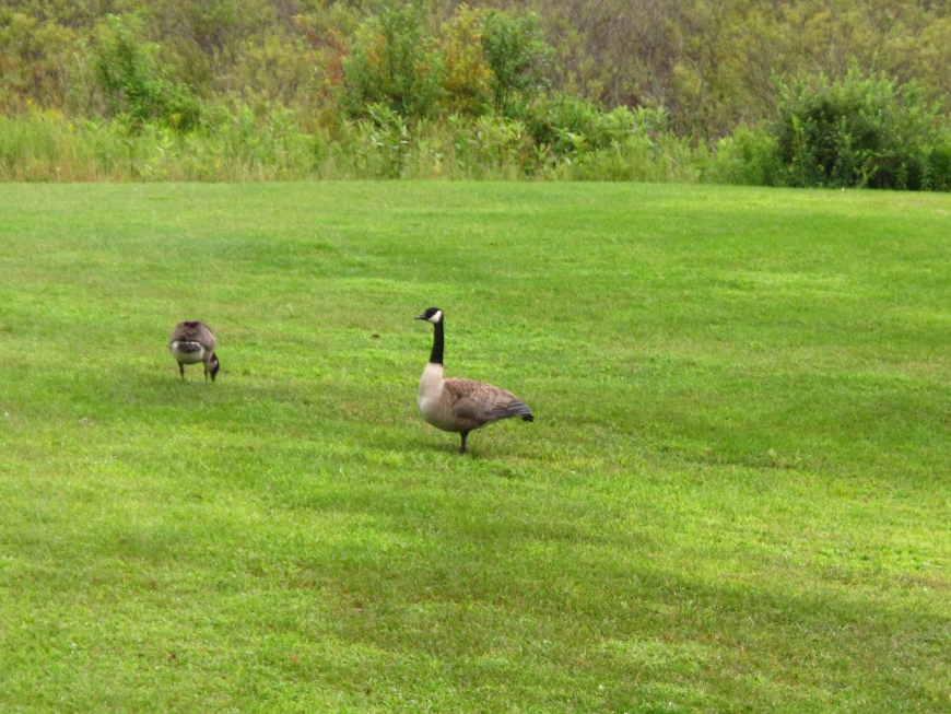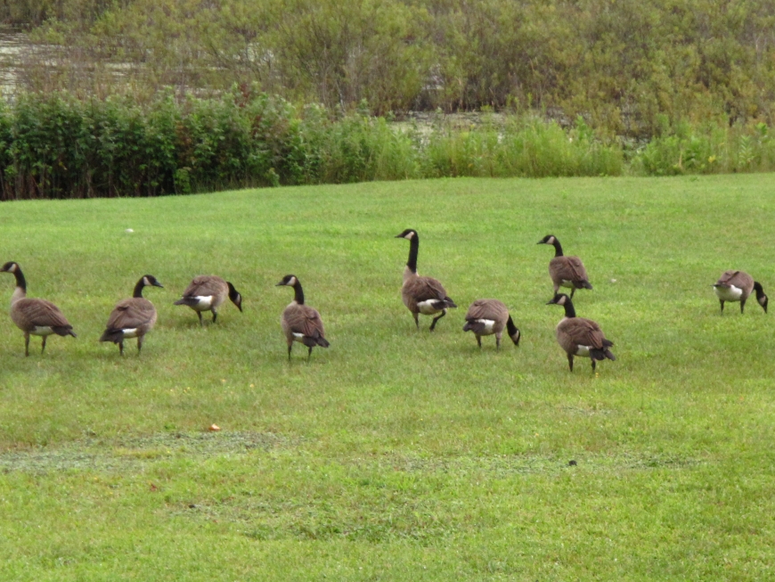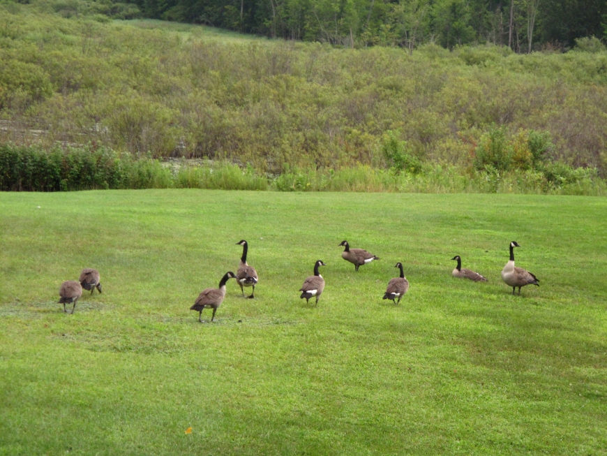 Our neighbors have geese nesting in their yard. The goslings have grown to adolescent geese, and are soon going to leave.