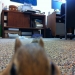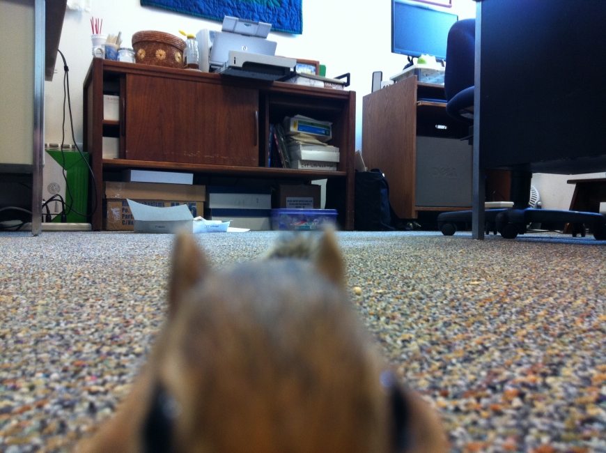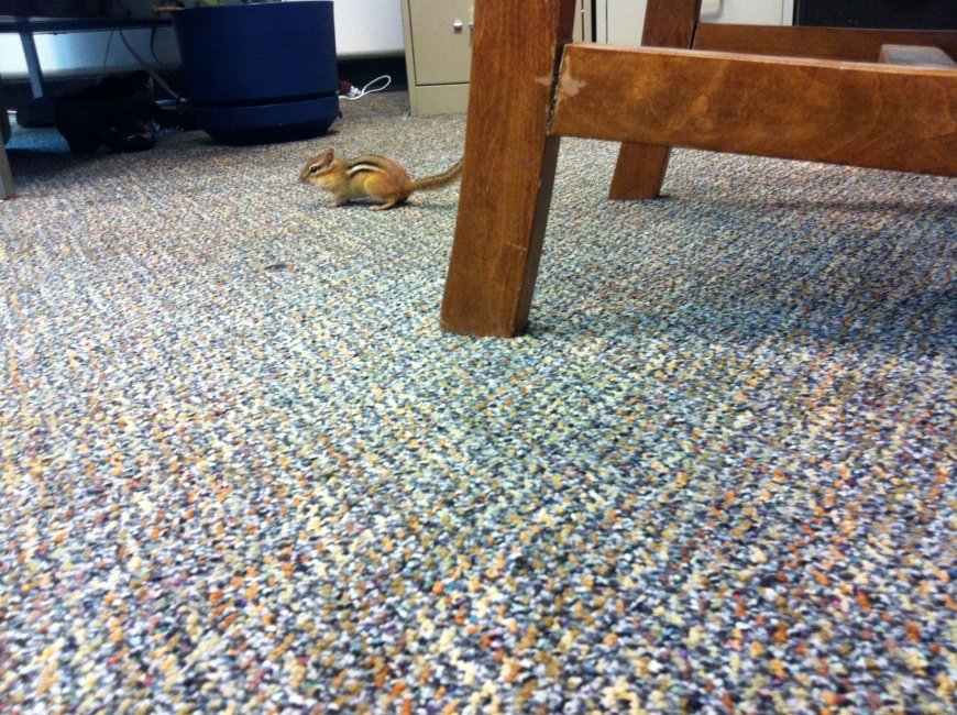 There is a chipmunk living in one of the offices at St. Lawrence. After taking a few pictures, it ran up to see the camera.