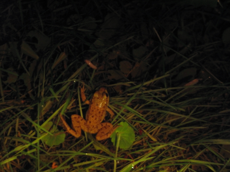 In the middle of the night, I was walking back to my house, and saw a frog jump. Earlier I had posted a picture of a pickerel frog, and this was a leopard frog. A pickerel frog has squarish-shaped spots that are close together, while a leopard frog has circular spots that are far apart.