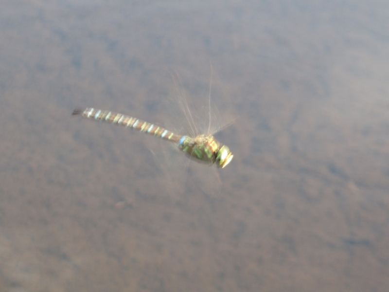 Over a small pond, these dragonflies are everywhere. I walked out onto a small stump to take pictures, and this dragonfly hovered right in front of me. I took a picture, just as I fell backwards off the stump. At least you can still see the main features of the dragonfly. It has stripes of blue and green down its tail and abdomen, and a bright green head.