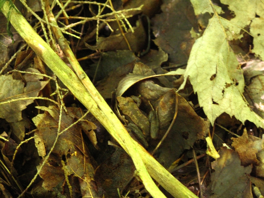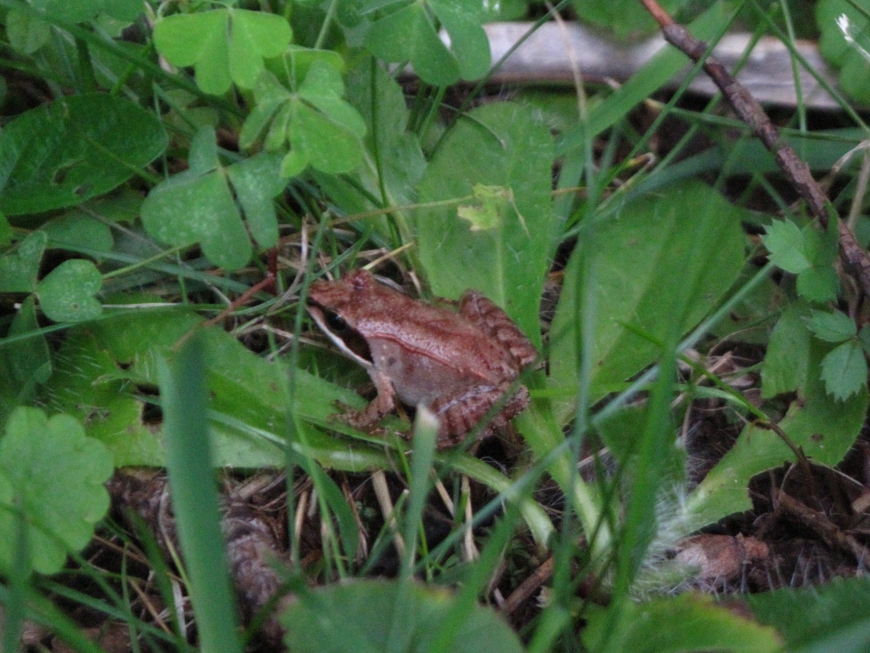 Wood frogs are found all over the North Country. They blend in to their environments very well (as seen in the second picture) with a brown or tan color, and have a dark eye mask.