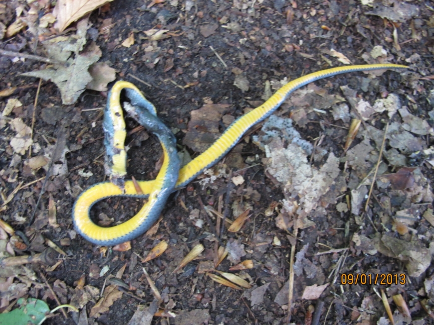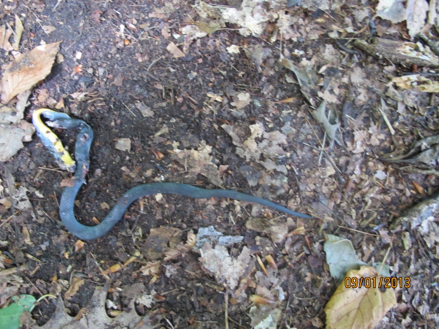 The Northern Ringneck Snake was the first my husband and I (both St. Lawrence County natives) had ever seen. Its head had been removed and we speculated that perhaps a bird had had it and dropped it from above. It was on a portion of trail we'd already come down, so it was freshly killed (an hour to 1.5 hours), I believe.