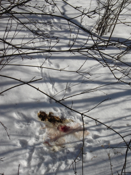 This isn't a recent encounter, but it is one I am curious about. I came across this track on March 23, 2014 while out skiing. I’m hoping it is obvious to someone else just what made this track. Did the animal’s tail make the inner track? Or was the animal dragging something between its legs? I came to a rather gruesome scene near the edge of a swamp. There were many tracks there, and I could not tell if that location was the beginning or the end of the trek I had followed. I'll be very glad to have this puzzle solved.