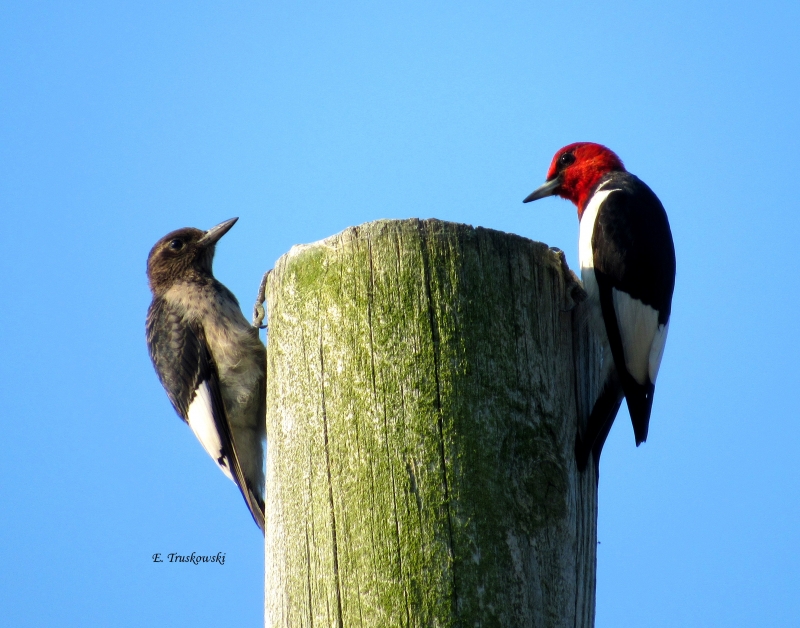 As we pulled up to the Oneida Lake boat launch, the adult bird was on a near by tree. I could hear it calling. A juvenile bird then flew in. They both flew to a pole that had a few holes in it. The adult pulled out a large grasshopper that it looked like had been stored in the hole. The adult ate the insect as the juvenile attempted to steal bits and pieces. These are absolutely amazing birds! The red color on the head almost makes them seen unreal.