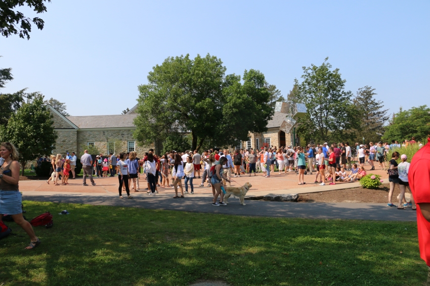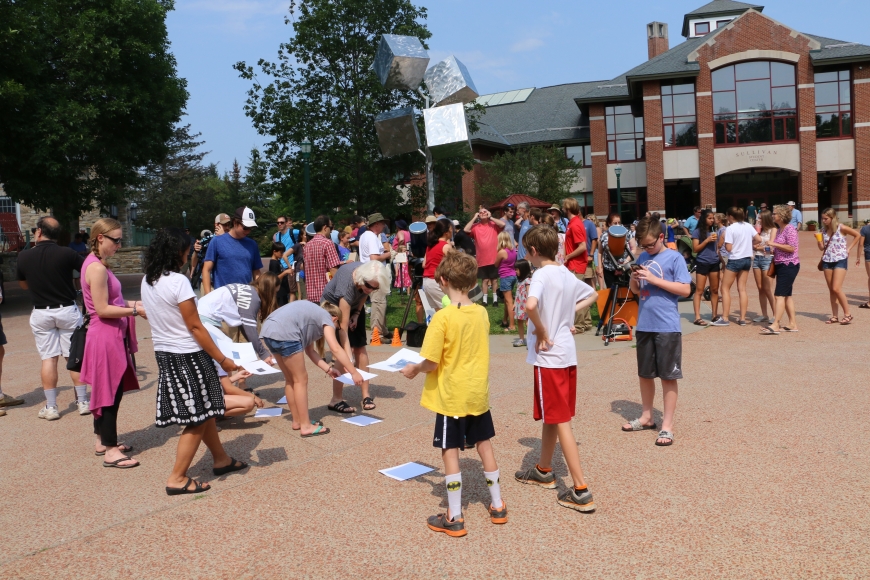 Quite a crowd gathered on the St. Lawrence campus for the 2017 partial eclipse. Jeff Miller, from the SLU physics department, set up telescopes and provided "eclipse glasses" - specially designed temporary shades that allow the wearer to look at the sun during the eclipse. Others brought homemade pin hole viewers and welding glass to explore different effects. The celebration of this unique astronomical event also felt like a celebration of the end of summer - college students and families mingled, blankets were set out, and frisbees and eclipse glasses both flew from hand to hand as everyone enjoyed the spectacle.