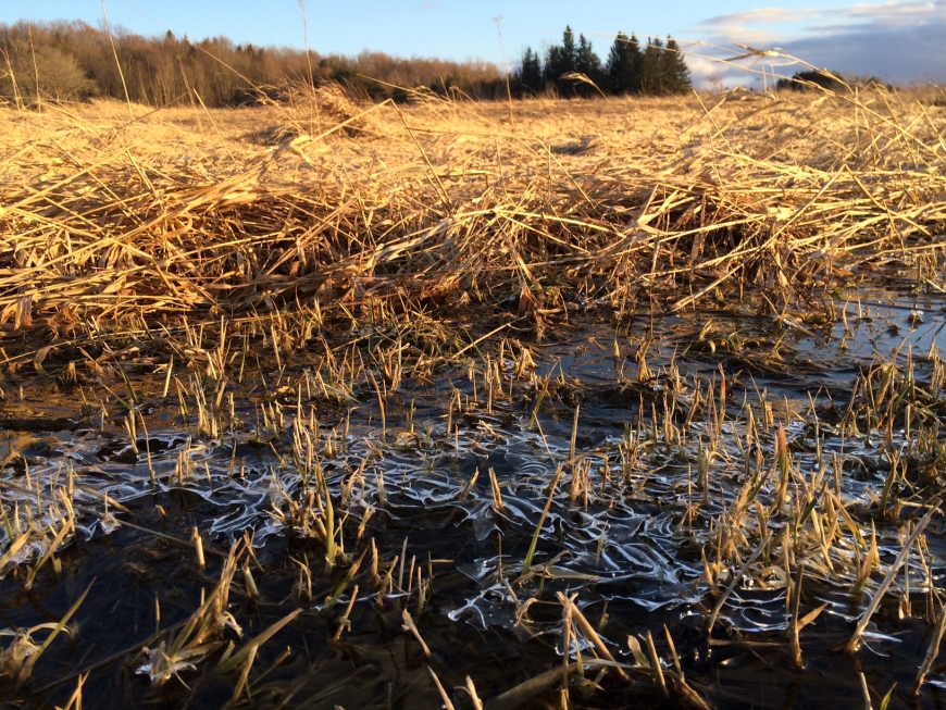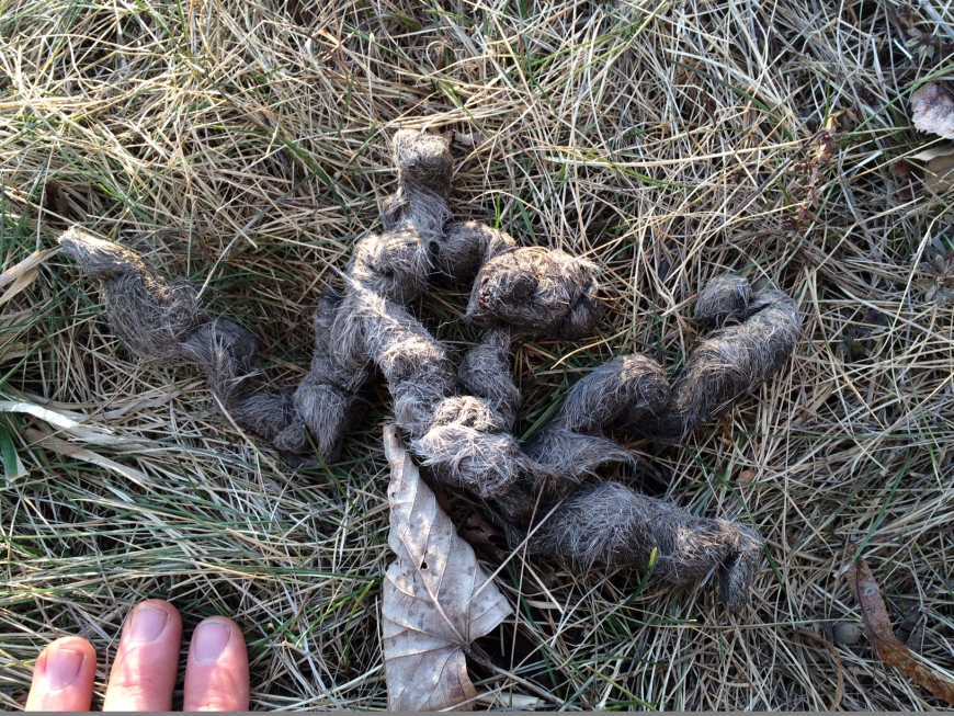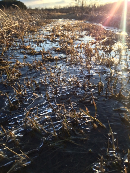 The field by this part of the Little River flooded this weekend, and I was captivated by the shapes the ice formed as it froze in thin layers around the grasses. Nearby, we came upon this impressive scat sample. Best guess is a coyote- one who's been snacking on snowshoe hare by the looks of it.