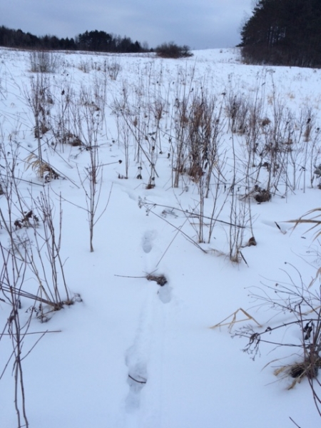 Out for a quick morning ski with the pup. The river was loud in the quiet of the morning, and Tigger had trouble containing his excitement. It may have been an early start for us, but not for some, several fresh white-tailed deer tracks already criss-crossed the field.