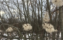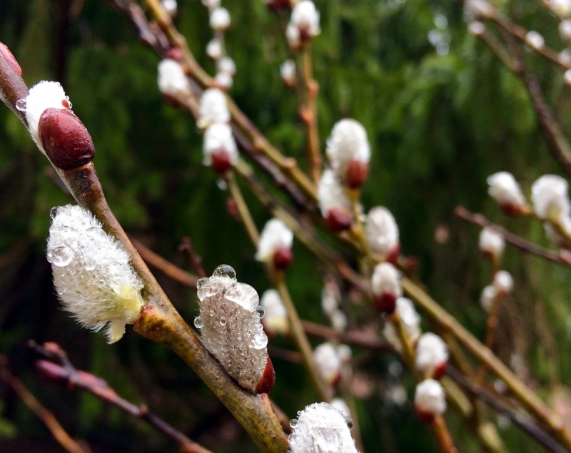 On the search for signs of spring, I stopped in the rain to get a closer look at this lovely pussy willow (Salix discolor) flowering outside Johnson Hall of Science at St. Lawrence University. The fussy flowers are called catkins, and appear on many species in the trees in the birch (Betulaceae) and willow (Salicaceae) families.