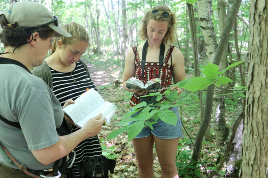 Keying out an American beech (Fagus grandifolia) along the trail.
