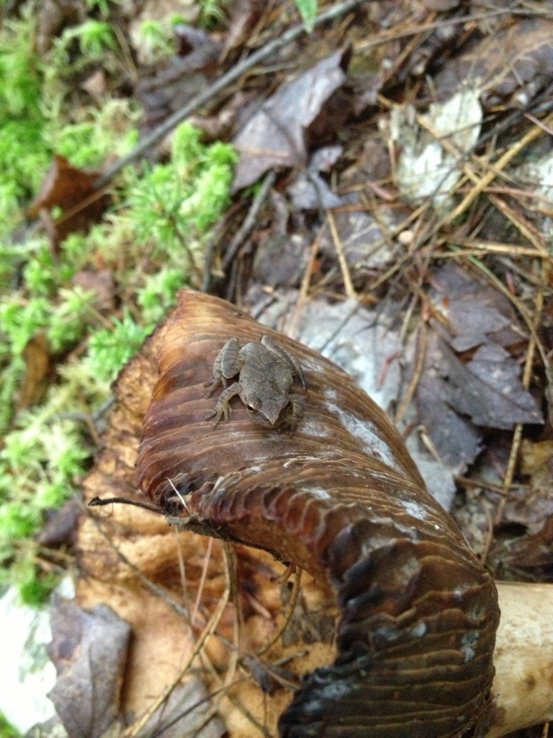 I spent a few hours today wandering through the forest at a snail's pace. I looked through the mosses, peered into wood pecker holes, turned over a few leaves and stumps to see what lay beneath. As I lifted a rotting mushroom to see how it was changing now that it stopped growing and had given up its spores, I spotted this little spring peeper clinging to the underside. They are a common find here in the North Country, but it was especially neat to watch this peeper for a long time, observing its breathing and wondering where it might be going next.